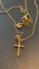 This stunning gold cross pendant necklace is perfect for any occasion. The elegant design features a sparkling gold finish that adds a touch of sophistication to your look. Swarovski elements in cross and bale. Measures: 17” chain. Swan hang tag. Marked on back of cross and swan. With bale measures 1”. Very delicate piece.
