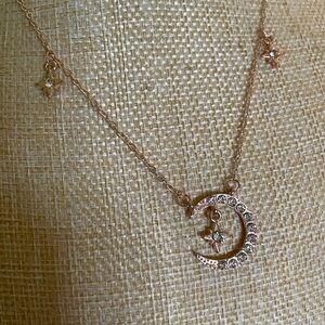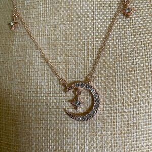 This stunning gold necklace and earrings features a crescent moon and star design, perfect for adding a touch of elegance to any outfit. The intricate detailing and shimmering stones make it a standout piece.