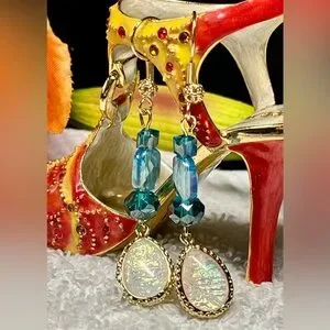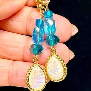 Add a touch of elegance with these stunning gold and blue dangle earrings. Perfect for any occasion. Hypo wires