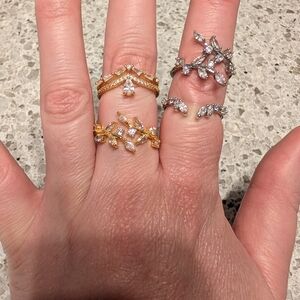 These 4 exquisite rings feature a delicate leaf design, available in both gold and silver tones. Perfect for adding a touch of elegance to any outfit. 3 are adjustable sizes, one size 6.
