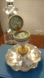 Enhance your home decor or collection with this elegant, vintage decorative musical egg. I believe it is a goose egg. It features a stunning gold, white, and green design. The interior has light green fabric with a delicate chain and a rose flower. The exterior of it is very detailed with a crown, butterfly, florals, and faux gems. Refer to photos for the details. The song it plays "Somewhere My Love." Good condition. It was well cared for. The winder works. Refer to photos for condition. It is a unique and beautiful vintage piece.