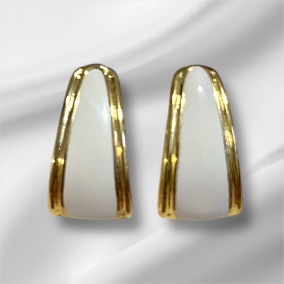 These elegant earrings feature a stunning combination of gold and white, perfect for any occasion. Add a touch of sophistication to your outfit with these beautifully crafted pieces.white enamel accents