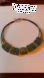 This statement necklace features striking green and gold tones on three-strand black cord. This collar style necklace is lightweight and versatile. It’s been pre-loved and is in good condition.