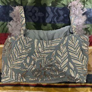 Dupatta – A sheer, net dupatta in the same grayish-blue shade, embellished with gold floral sequins throughout. The border is adorned with soft feather-like detailing, adding a touch of sophistication.