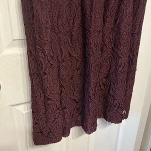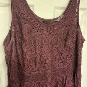 This elegant sleeveless dress features a beautiful lace design in a rich burgundy/dark purple color. Perfect for any occasion, it offers a sophisticated and stylish look. Purchased from Pennington or Addition Elle.