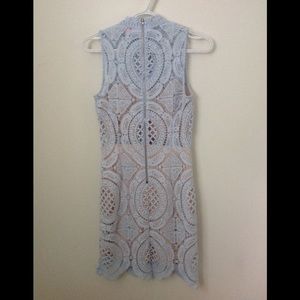This elegant sleeveless dress features a delicate lace design in a beautiful light blue color. Perfect for any occasion, it offers a sophisticated and stylish look.