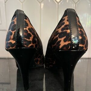Elevate your look with these stunning leopard print heels featuring a glossy black cap toe. Perfect for making a stylish statement.