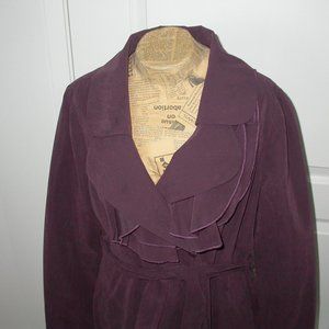Maroon spring/autumn trench coat with ruffled collar - double breasted - rear kick pleat - lined - belt - faux suede - size L - 22" pit to pit - 34" shoulder to hem - new, never worn
