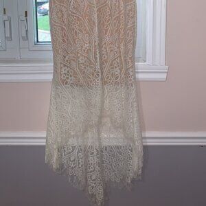 Stunning mermaid-style dress in white and cream, featuring intricate lace details and a small train. Worn only once and in excellent condition. Labeled as a size large, but it fits more like a medium. This elegant gown is perfect for special occasions, adding a touch of sophistication and glamour to your look.