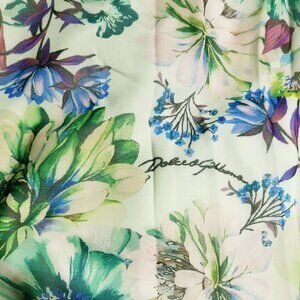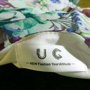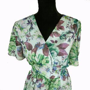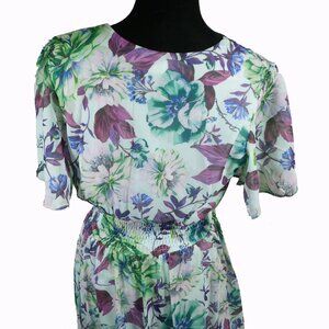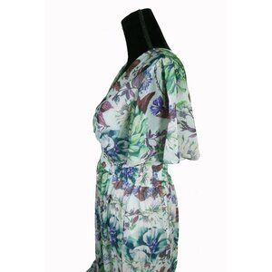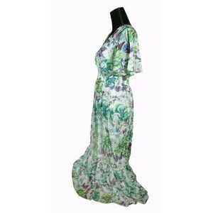 Elegant Maxi summer dress with vibrant floral motif in an airy flowy material and gathered waist has nods to Edwardian tea gowns but with a modernized look. With a butterfly sleeve, “v” neck, rushed elastic waist, and bottom ruffle this dress will flatter and impress. The dress has a pale mint green background with green, white and tiny blue flowers and purple leaves. The dress has an attached inner lining. The dress is made by UG -New Fashion Your Attitude-. Pre-owned very good condition. No size tag so please check measurements. My dummy wasn’t tall enough…the skirt pools on the floor below.