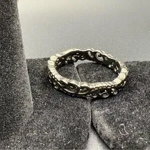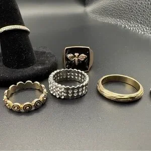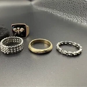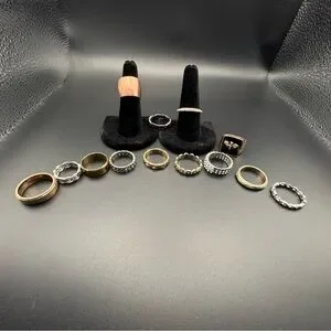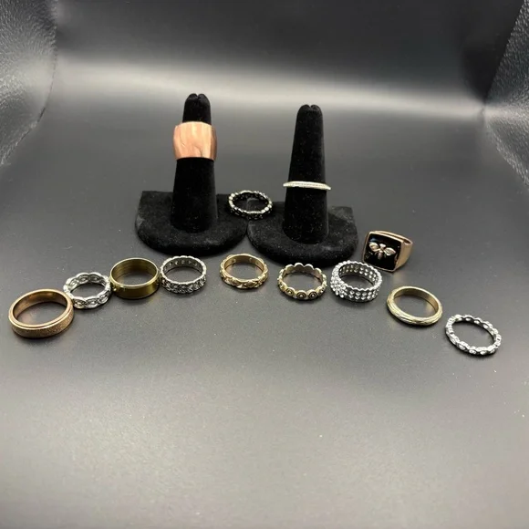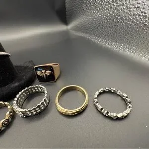 A stylish collection of mixed metal rings featuring gold, silver, and black tones. Perfect for any occasion.