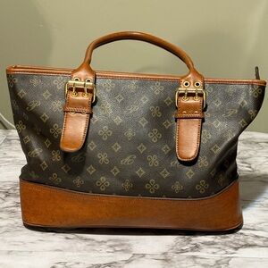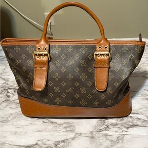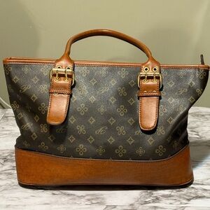 Chic tote bag featuring a monogram design. Accented with rich brown faux leather trim and handles. Ideal for daily use.