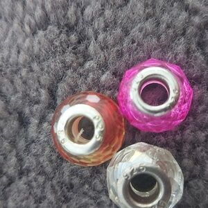 Add a touch of elegance to your jewelry collection with this stunning bead set. Featuring vibrant pink, clear, and orange beads, these pieces are perfect for any occasion. Marino blown glass . diamond cuts pattern. 925 silver insert. pandora inspired