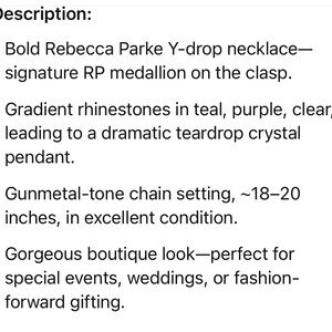 See photos for description. #RebeccaParke #StatementNecklace #YDropNecklace #EventJewelry #CocktailJewelry #BridalStyle #EveningGlam #BoutiqueJewelry #GiftForHer #PoshFinds