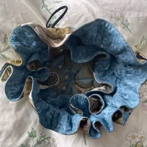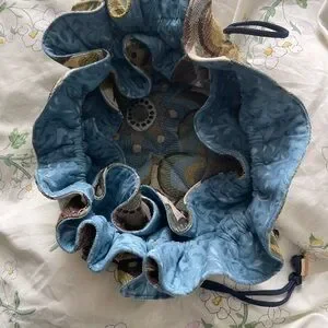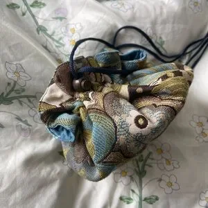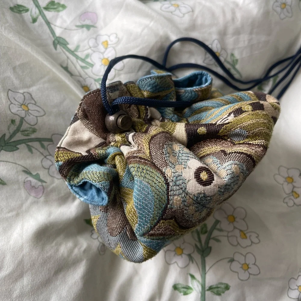 This elegant drawstring pouch features a beautiful multicolor design, perfect for adding a touch of style to any outfit. The intricate pattern combines shades of blue, green, and brown, making it a versatile accessory for any occasion.