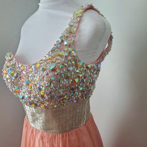 * STUNNING Overall Design * Gorgeous Aurora Borealis Colours * EXQUISITE Bead Work * Very Attractive for wedding, prom, any formal party * Satiny multi layered flowy skirt * Sophisticated Formal Fairy Dress