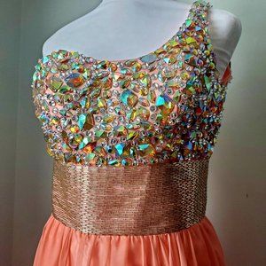 Elegant One Shoulder Gown Dress Satiny Layered Skirt Beaded Aurora Borealis