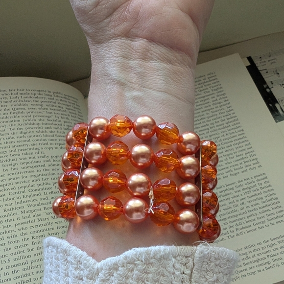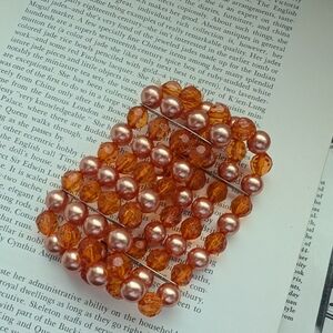 Add a touch of elegance with this stunning orange and gold beaded bracelet. Perfect for any occasion.