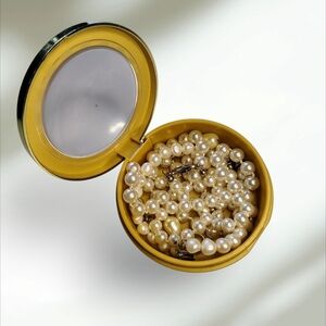 Beautiful pearl treasure chest jewelry seypaired with a stylish yellow jewelry box. Perfect for adding elegance to any outfit.