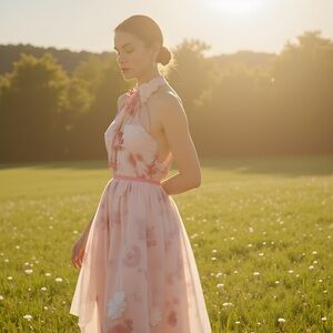 Chic pink halter dress with floral design. Perfect for special occasions.