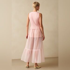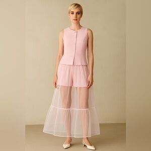 Step into elegance with this three-piece coordinated set featuring a tailored pink vest, classic high-waisted shorts, and a flowing sheer organza skirt overlay. This ensemble is designed to offer a sophisticated yet playful aesthetic—perfect for spring events, garden parties, or summer occasions where elegance meets a modern twist.