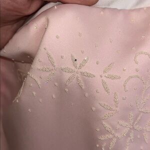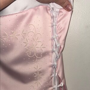 Beautiful pink strapless gown with delicate embroidery. Perfect for formal occasions. Two original bead defects please see photos