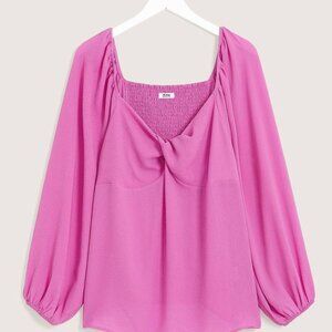 Easy on the eyes, this boho-inspired plus-size blouse is styled to charm with its twisted front detail. Fashioned with gently puffed sleeves adorned with shirring at the shoulders, it is punctuated with a sweetly smocked back for a feminine touch.