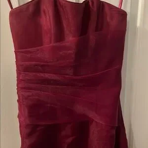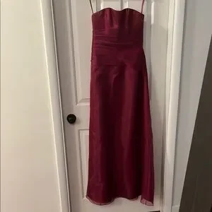 This elegant raspberry strapless dress is perfect for grad, gala or wedding party. The rich color and custom make is elegant and high end. Corset top with boning for shape, extra optional coverage in the back under lacing. Sized as an 8 in the dress but closer to a 6, although the corset style does offer forgiveness. Organza layer with ruching at midline makes this dress flattering and whimsical. Classic and timeless. Flawless. Worn once.