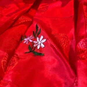 Luxurious red robe perfect for lounging. Features a soft, comfortable fabric with a stylish design. No size tag, it would fit in the small. In excellent used condition.