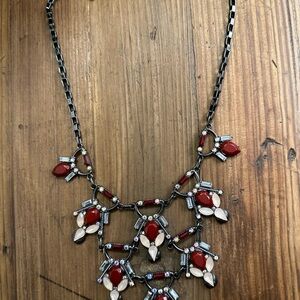 Make a bold statement with this elegant necklace featuring striking red and cream accents. Perfect for adding a touch of sophistication to any outfit.