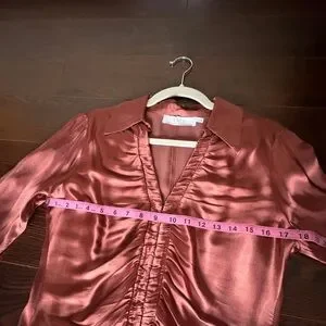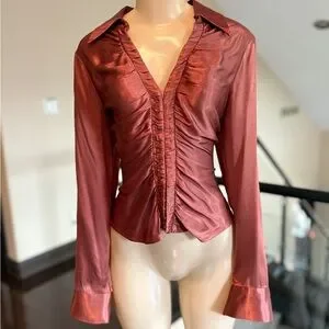 Elevate your style with this elegant satin blouse featuring a chic ruched design. Perfect for any occasion, this rust-colored top adds a touch of sophistication to your wardrobe.