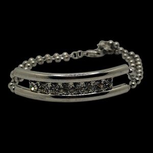 This stunning silver bracelet features elegant black accents, perfect for adding a touch of sophistication to any outfit. Ideal for both casual and formal occasions.