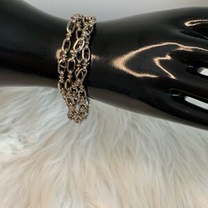This exquisite silver bracelet showcases a beautifully intricate chain design, featuring interconnected loops that create a delicate and airy pattern. Its smooth, lustrous surface catches the light, adding a touch of sophistication to any outfit. Ideal for those who appreciate fine craftsmanship and timeless elegance.