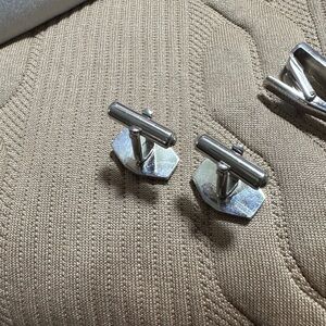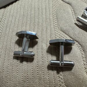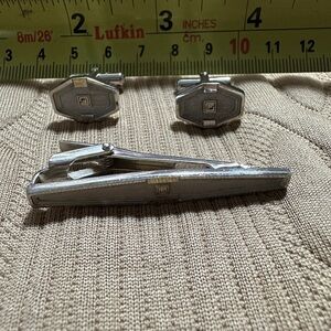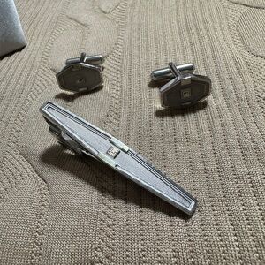 Enhance your formal attire with this elegant silver cufflinks and tie clip set. Perfect for adding a touch of sophistication to any outfit.