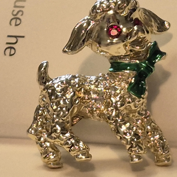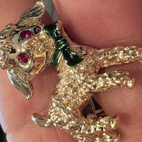 This silver dog brooch features a charming design with a green bow accent. Perfect for dog lovers, it adds a touch of sophistication to any outfit.