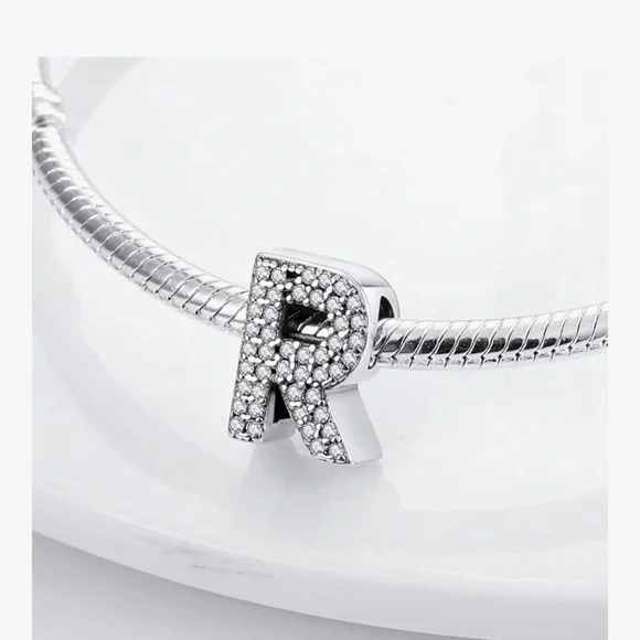 This stunning silver bracelet features a sparkling initial 'R' charm, perfect for adding a personal touch to any outfit. Its sleek design makes it a versatile accessory for any occasion.