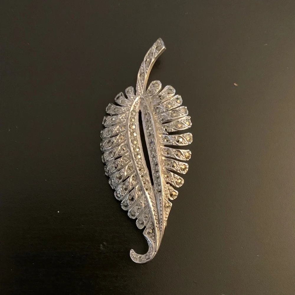 Stunning silver leaf-shaped brooch with intricate detailing. Perfect for adding a touch of elegance to any outfit.