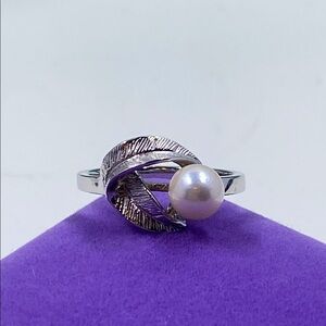 This elegant silver ring features a beautiful pearl set in a delicate leaf design. Perfect for adding a touch of sophistication to any outfit.