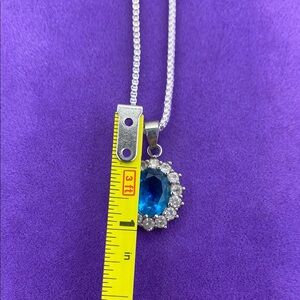 This stunning necklace features a vibrant blue pendant surrounded by sparkling white crystal accents. Perfect for adding a touch of elegance to any outfit.