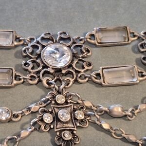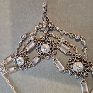 This elegant silver necklace features intricate designs and sparkling accents, perfect for adding a touch of sophistication to any outfit.
