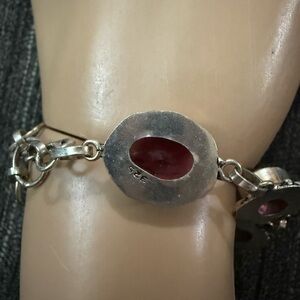 This elegant bracelet features stunning pink stones set in a sleek silver design. Perfect for adding a touch of sophistication to any outfit. Stamped 925