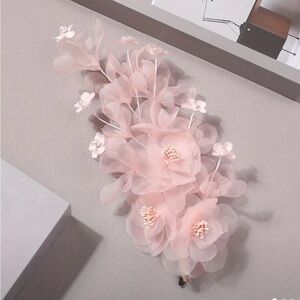 Chic hat featuring a silver and white design. Adorned with a delicate flower accent and ribbon details. Perfect for special occasions.