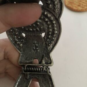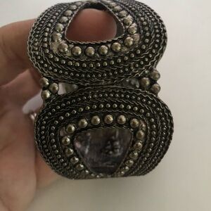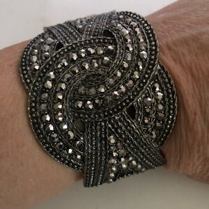 Stunning gunmetal cuff bracelet with an intricate pattern of rhinestones. Works well with evening wear or dress down for casual wear. Please check pics.