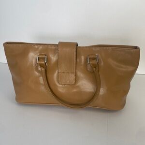 This elegant tan leather purse is perfect for any occasion. Its sleek design and high-quality material make it a must-have accessory. In perfect condition.