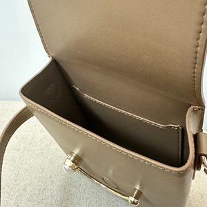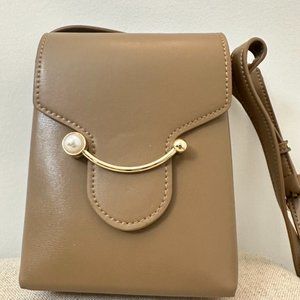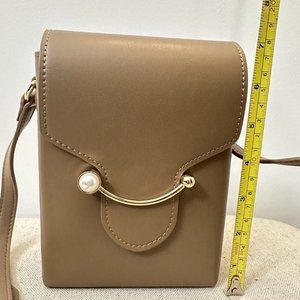 Elegant Tan Leather Small Shoulder Bag with Pearl Bead Slide Closure