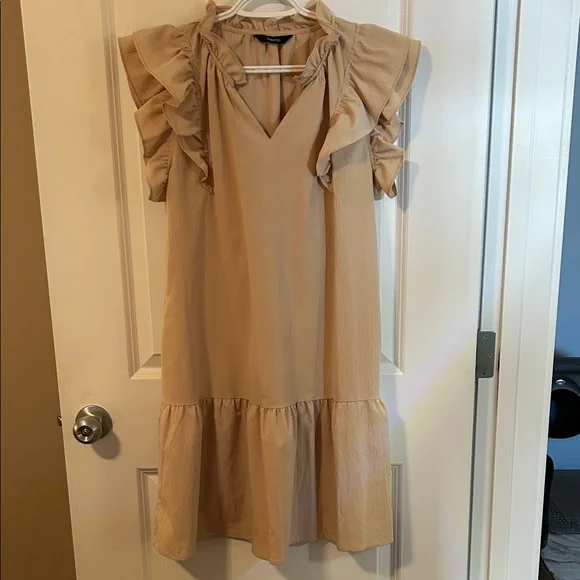 This elegant tan dress features stylish ruffle sleeves, perfect for any occasion. Its soft fabric and flattering design make it a must-have addition to your wardrobe.