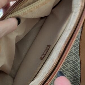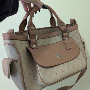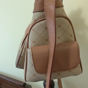 This elegant handbag features a stylish tan and cream design, perfect for any occasion. Its sophisticated look is complemented by high-quality materials and craftsmanship.