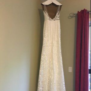Note(s): bustle added for the train; very minor damage on hem, top zipper, and bustle hook; originally purchased from Delica Bridal in Edmonton, AB