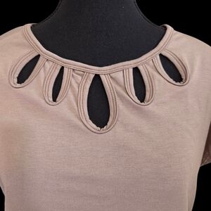 This elegant tan midi dress features a stylish cutout neckline, perfect for any occasion. Its soft fabric ensures comfort and style. Length 37" Bust 38"