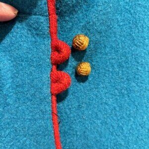 A unique Asian style jacket made of boiled wool and decorated with unique embroidery patterns on the front and on sleeves. A gorgeous combination of turquoise and rust colors. It has a Mandarin collar, a fabric closure of beautiful metal buttons. The buttons imitate those hand pulled on a frog closure. It is hard to button. Inside is lined and has a hidden pocket. Tags still on, never worn